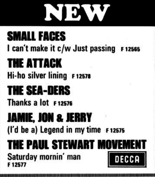 The remaining members of the band - Jon, Jerry and drummer, Jed Kelly evolved into The Jon Derek Group with the addition of Albert Lee on lead guitar and Dave Sholl on bass. This was a skeleton band primarily put together so as to honour any outstanding bookings and, to act as 'backing band' to Irish singer, Clodagh Rodgers (spelt Cloda Rodgers prior to 1969) on all her forthcoming TV and Radio appearances.