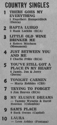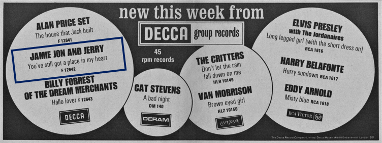 The band's second and, most successful single was released July 28, 1967 - You've Still Got A Place In My Heart produced by Dick Rowe (the man who turned down The Beatles but made up for it by signing The Rolling Stones and Tom Jones). Don Arden spent roughly £1,000 on promoting the record and in an interview Jon said, "This is the best we have done and it is commercially good. We spent three hours on a Sunday morning in a studio with a 30-piece orchestra to get this sound." The single made No.5 on the Record Mirror Country Singles Chart wedged between 'Just Between You And Me' by Charley Pride (No.4) and 'Tonight Carmen, by Marty Robbins (No.6).