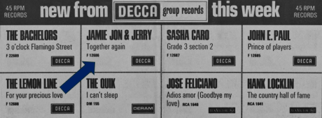 Jamie, Jon and Jerry's third single was released in October 27, 1967 - a cover of the Buck Owens hit Together Again. The production was disappointing and failed to capture that Nashville sound. It became a poor relation to that of it's predecessor, the well produced ballad, 'You've Still Got A Place In My Heart'. 'Together Again' would become the band's last release.