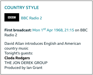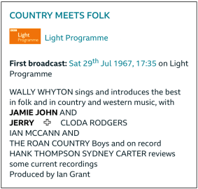 Jamie, Jon and Jerry secured a regular spot on a brand new weekly BBC Radio show called, Country Meets Folk presented by Wally Whyton. Recorded before a live audience at the 'Playhouse Theatre' in Charing Cross, London - the show went out on the 'Light Programme' which would later become BBC Radio 2. Appearing in their own right - they would also be tasked with backing other artists such as Clodagh Rodgers (below).