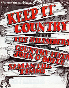 Country Fever were part of an 'all British' tour in 1972/3 promoted by the Derek Block Organisation. Featuring The Hillsiders, John O'Boyle and Samantha Timms. There were 15 dates in all and venues included; Barnsley Civic Hall, Darlington Civic Theatre, Hastings - White Rock Pavilion, Crewe Theatre, The Pavilion - Hemel Hempstead, The Playhouse, Weston-Super-Mare and Eastbourne's Congress Theatre.