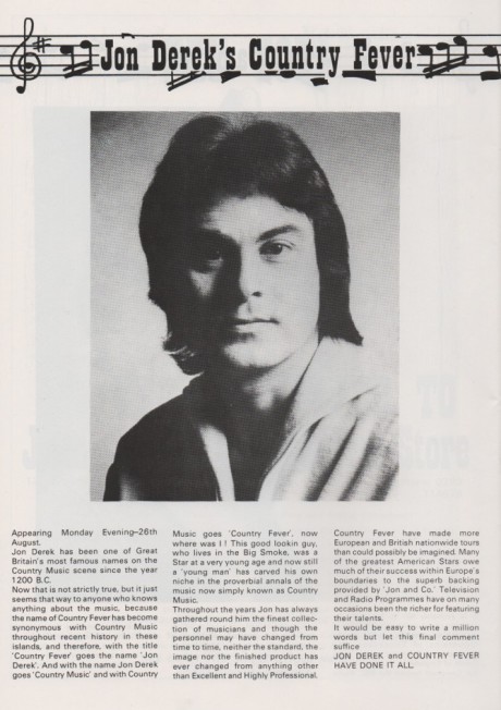 Advertised as Jon Derek's Country Fever - it was in fact Jon Derek's Honky Tonk Band that appeared at the 1981 event comprising of Jon Derek, Roger Rettig, Gerry Hogan, Clive